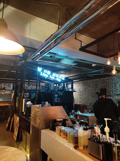 저녁을 먹고 늦은 시간에 가서 내부와 외부가 전혀 다른 위화감의 매력(!)이 더욱 진하게 느껴졌는지도 모르겠다. 그리고 이 카페가 대로변에 있지 않고 주택가와 상가가 혼합된 뒷골목(?)에 있어서 낡은 느낌이 더 잘 어울렸던 것 같다.